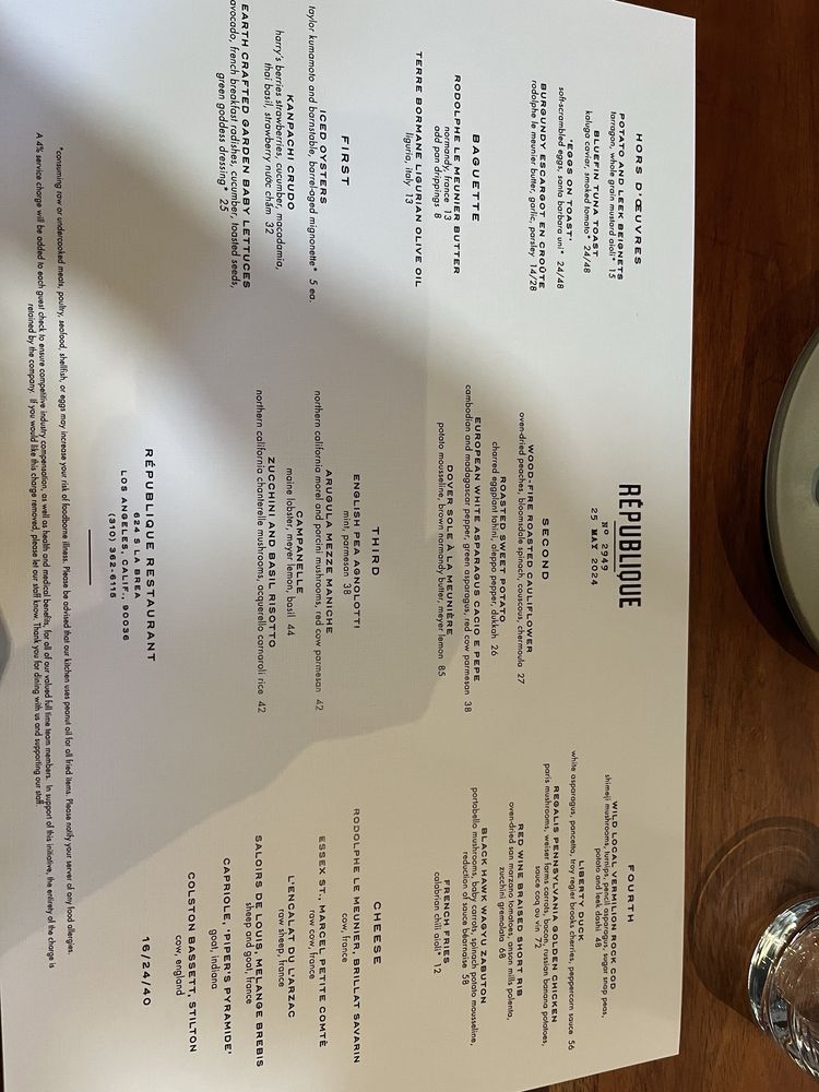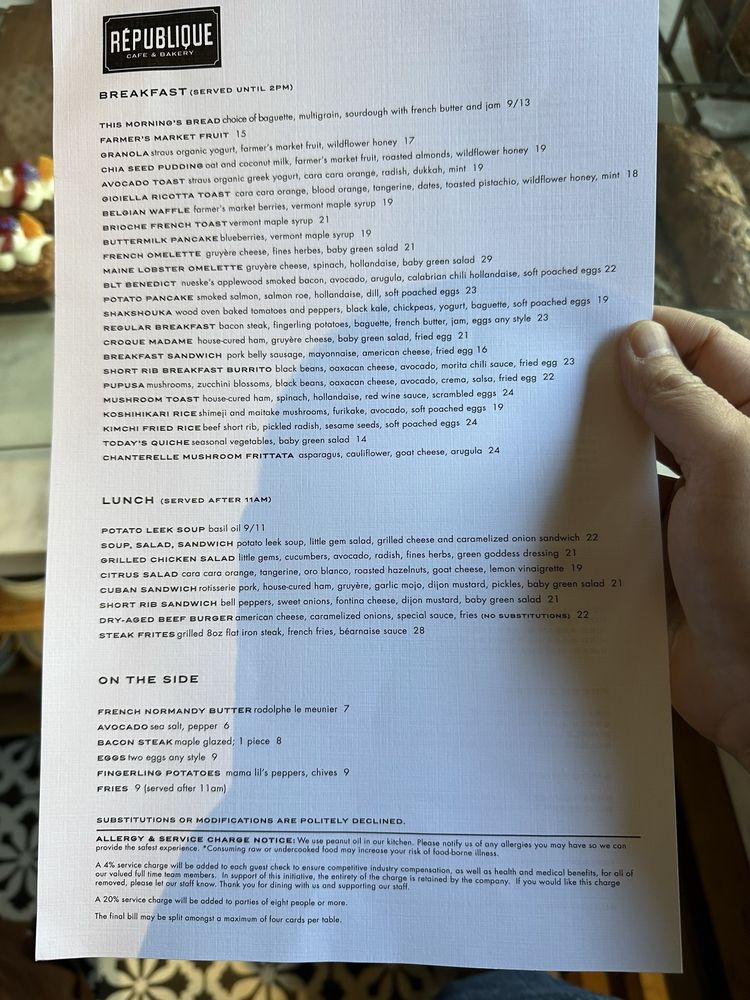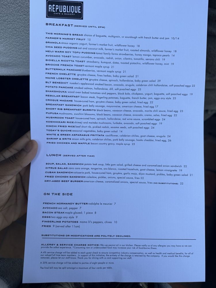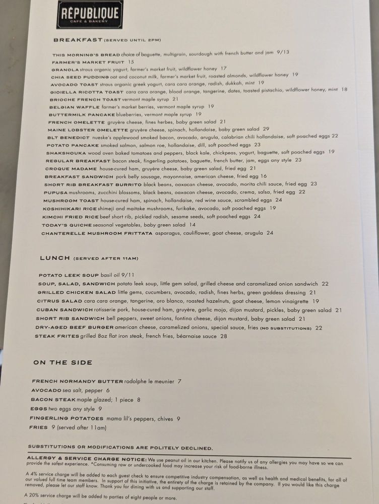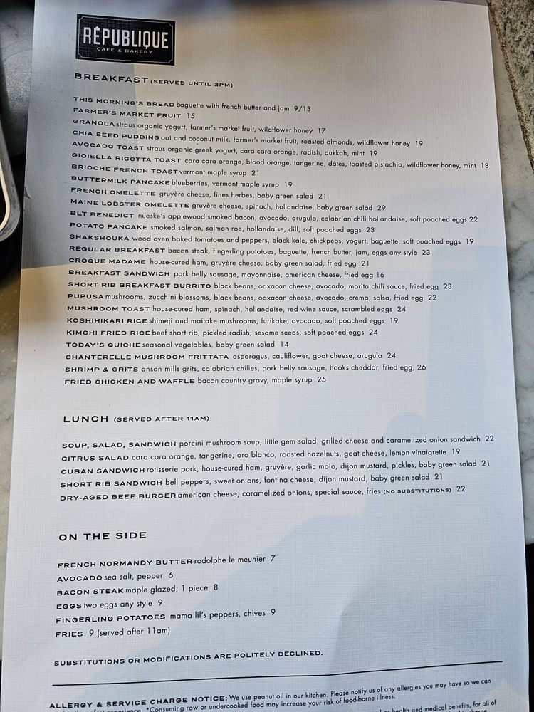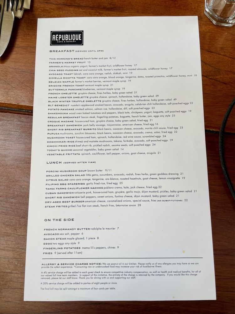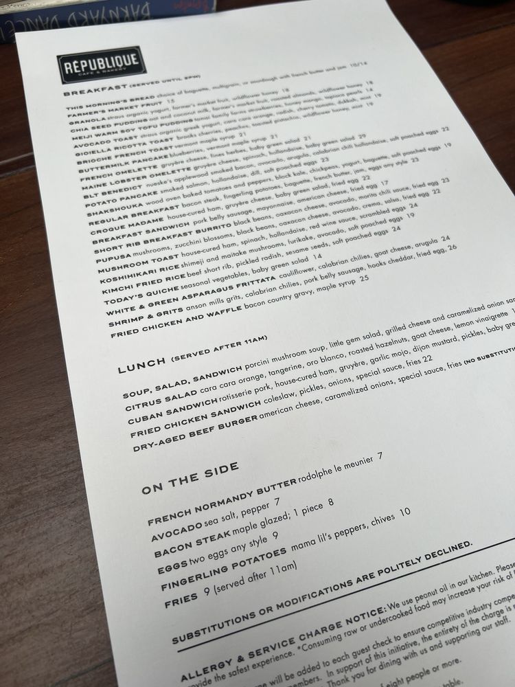 Republique, a French cocktail bar and breakfast/brunch spot located in Los Angeles, offers a diverse menu with a trendy ambiance. The restaurant provides a range of amenities including outdoor seating, free Wi-Fi, and valet parking. Customers praise the beautiful ambiance and delicious food, with standout items like Ube brioche, Berry Croissant, and the scrumptious Cherry Meyer Lemon Pie. The service is professional and attentive, enhancing the overall dining experience. While some note the long lines and slightly higher prices, the quality of the pastries and ambiance make up for it. With a Parisian dining experience and a menu showcasing high-quality French cuisine, Republique is a must-visit destination for food lovers in LA. The food is well-crafted, beautifully presented, and offers a unique twist on classic French dishes.